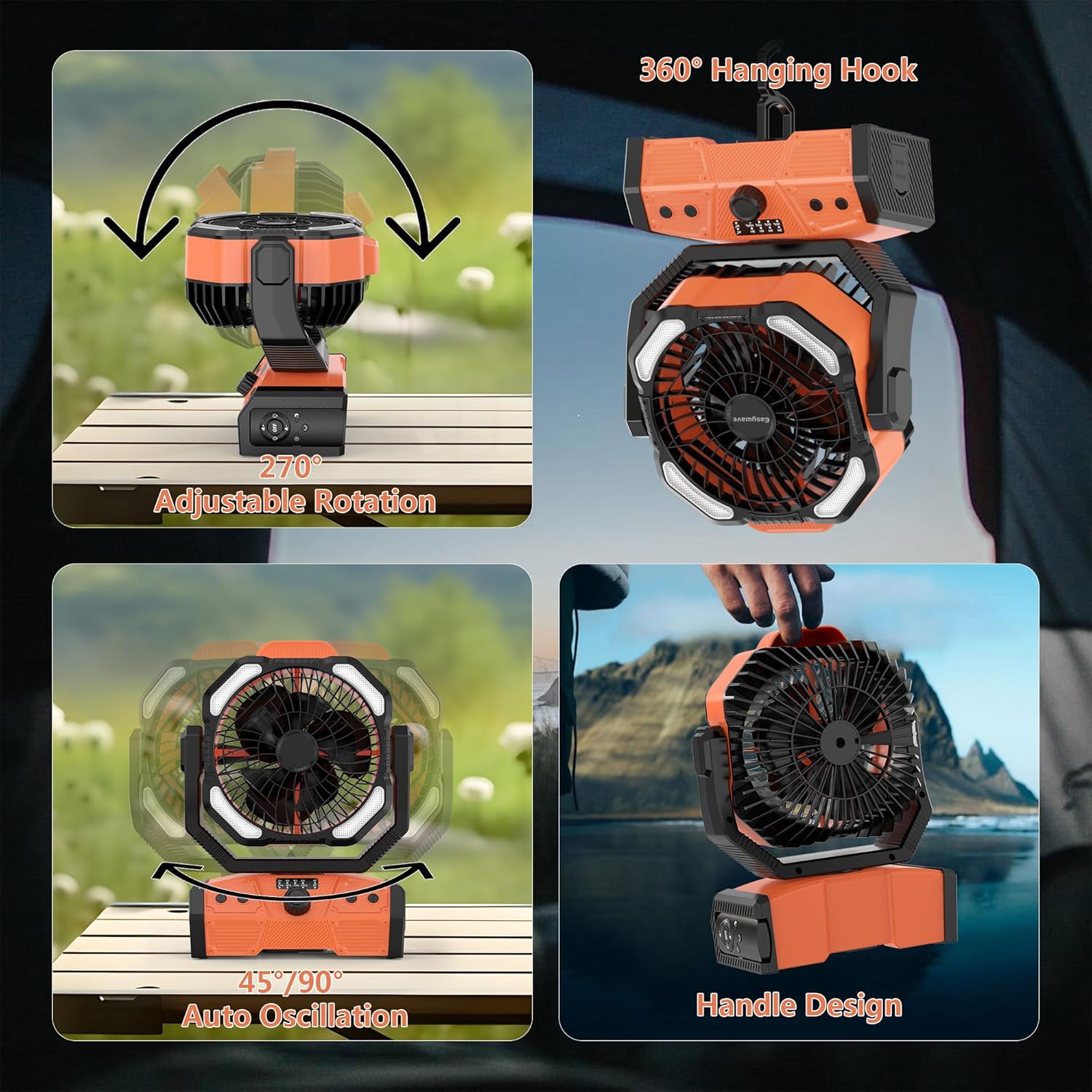 The built-in 360° rotating hanging hook allows you to hang the fan in tents, balconies, workshops, or any elevated surface. Ideal for camping and outdoor use.
